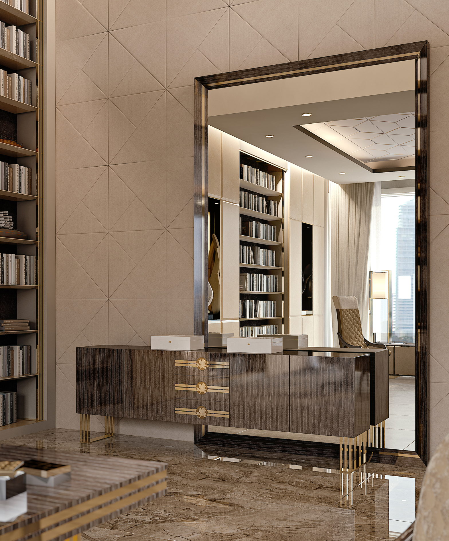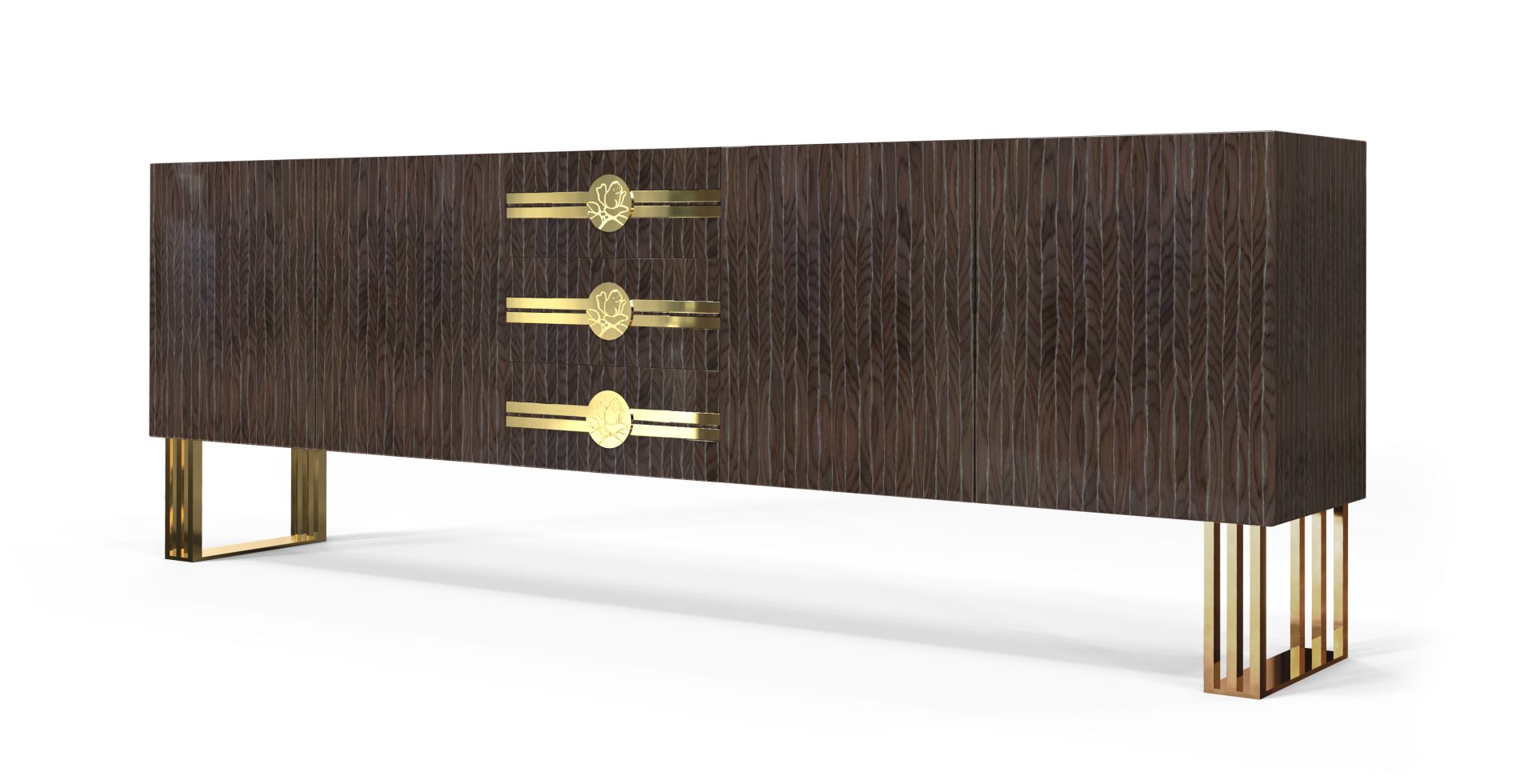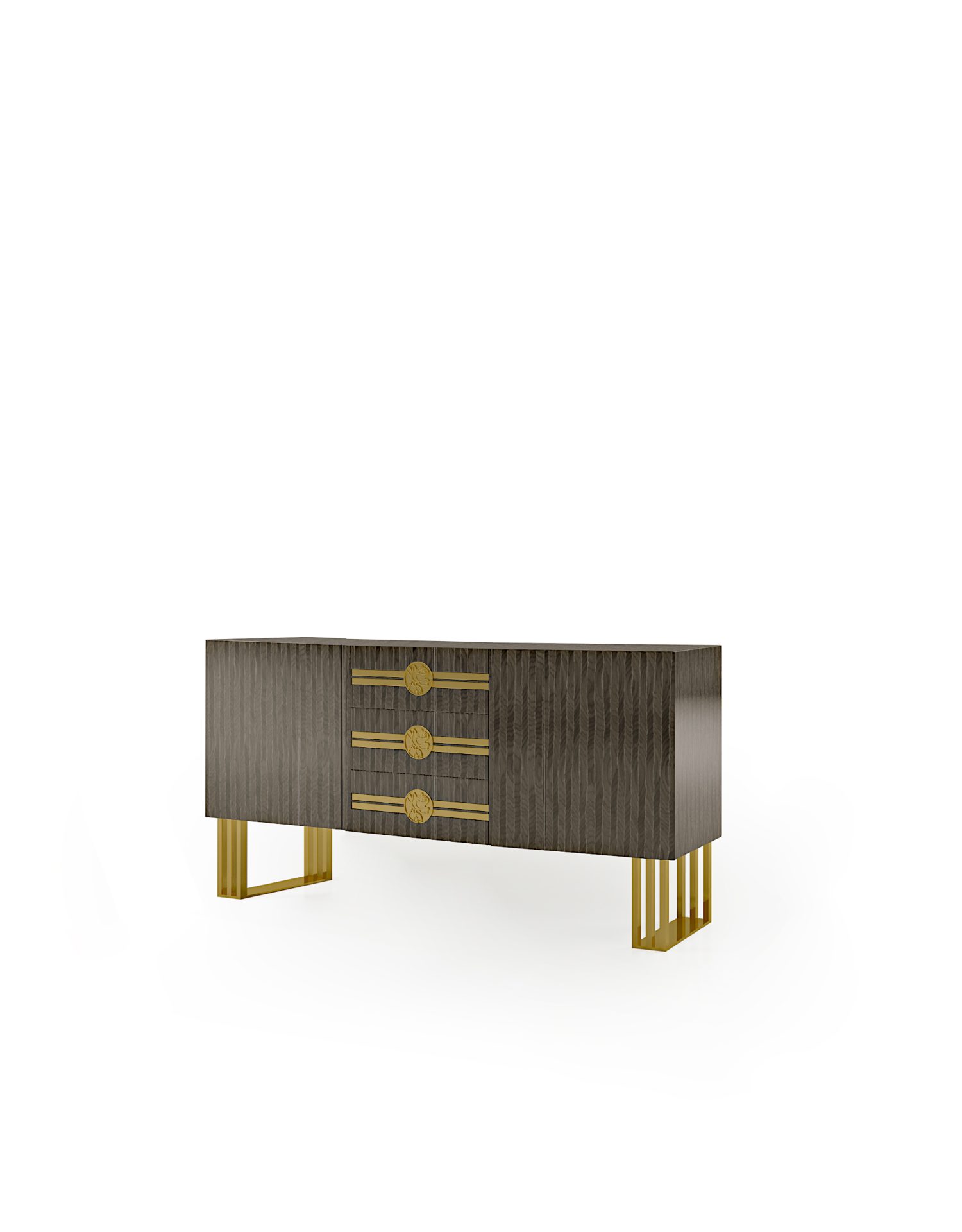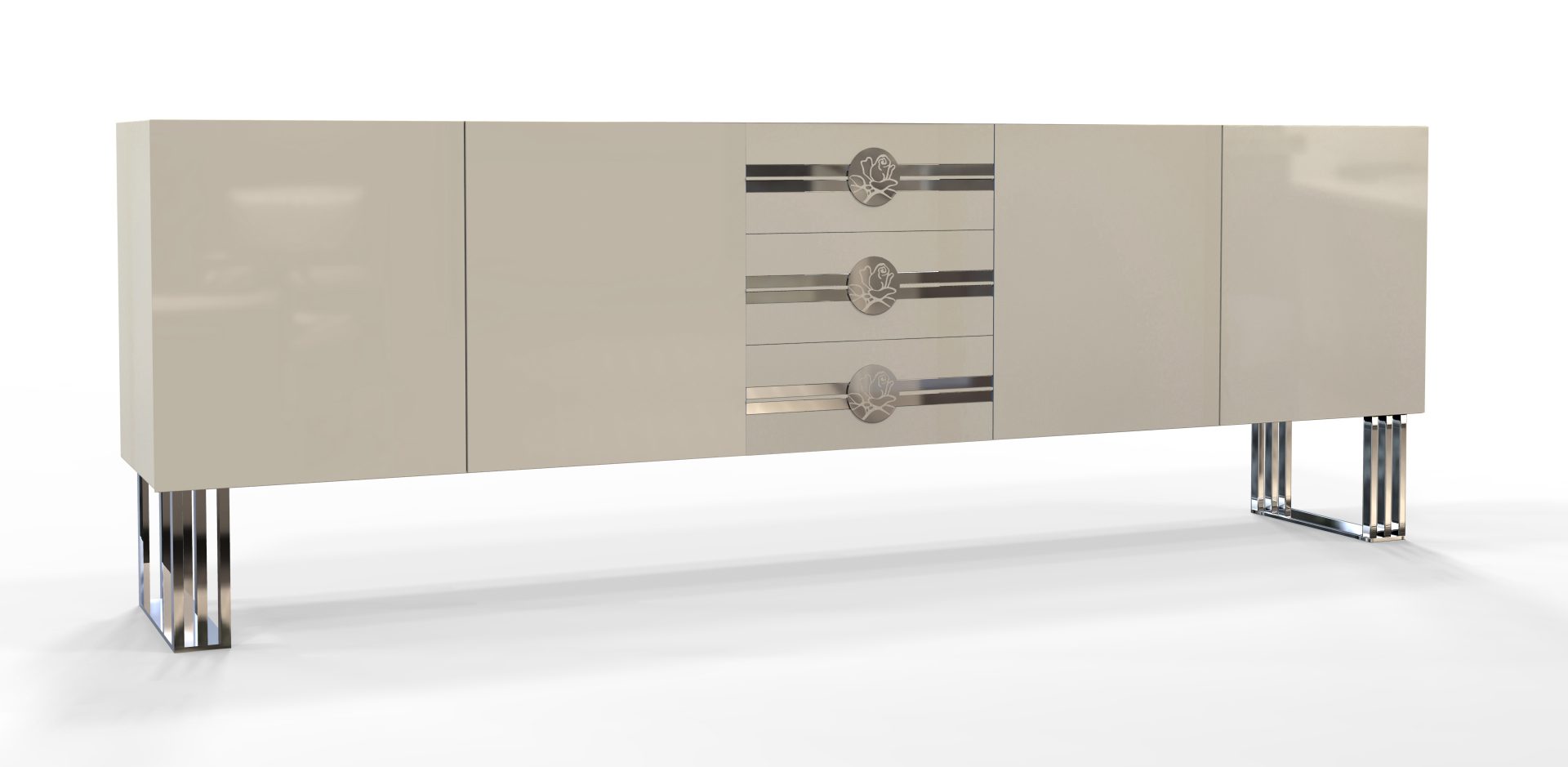 The Infinity sideboard by BizzottoItalia integrates perfectly into the dining environment, creating an extremely chic atmosphere. It is the perfect combination of the elegance of wood and the refinement of metals, designed to enrich the living area with a touch of sophisticated modernity. The sleek triad legs in 24-carat gold or chrome-plated steel can be paired with the precious Thai-Wood veneer, also available in a lacquered version for a cleaner aesthetic. The laminated bands and medallions with the stylized rose do not go unnoticed. These precious details recall the craftsmanship of goldsmithing, transforming this product into a true jewel. A timeless style elevates this sideboard, transforming it into an iconic element of style, perfect for those seeking harmonious and balanced decor.